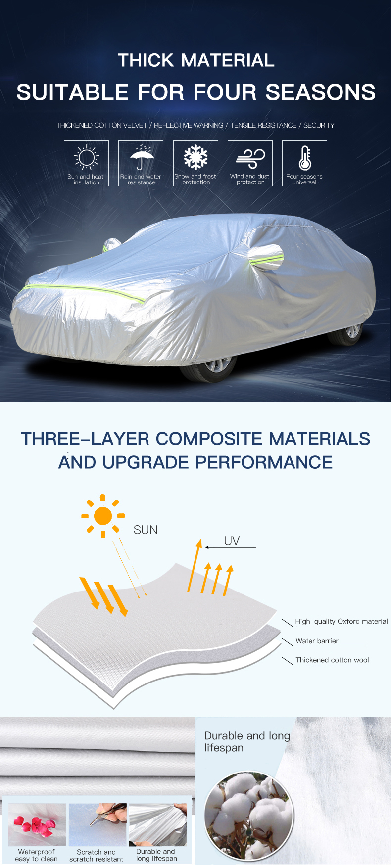 Product Advantage | 1.Low price, waterproof, dust-proof, sun-proof and anti-frost snow; 2.Strong and durable, resistant to pulling and not hurting car paint; 3.Double thread sewing, scratch resistant and more durable; | ||